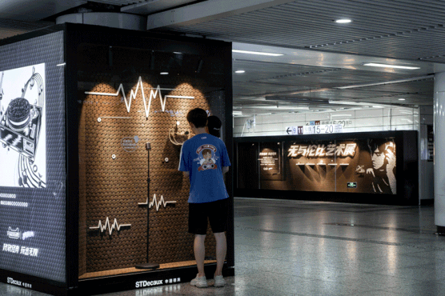 只要站在櫥窗前揮揮手,杯子緩緩傾倒,牛奶就會(huì)從魔術(shù)帽里冒出來(lái)。 互動(dòng)櫥窗2:玩聲音