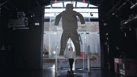 上海耐克NIKE體驗(yàn)店開發(fā)的原型(未實(shí)展)則展示了城市降雨的體驗(yàn):顧客靠近裝置時(shí)會(huì)觸發(fā)閃光燈(模擬雷電)和視頻投影的組合效果,透過雨簾觀看NIKE鞋在大雨中奔跑的鏡像。