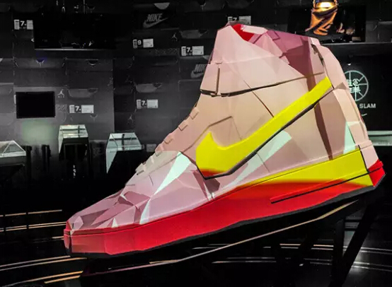 當(dāng)消費(fèi)者踏入該裝置的指定屏幕區(qū)域時(shí),巨大的耐克鞋子便會(huì)有不同的燈光效果,并伴以不同的音樂。參與互動(dòng)的消費(fèi)者越多,鞋子的效果也就越豐富。除此之外,每隔20分鐘播放的有關(guān)耐克十款經(jīng)典鞋的介紹視頻更系統(tǒng)地揭示耐克的理念。