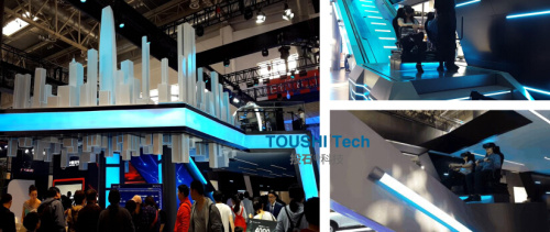 未來概念車體驗(yàn)艙,通過投影,模擬真實(shí)駕駛視覺。車內(nèi)還有塊屏幕,播放一些電視節(jié)目。讓人感覺置身于未來世界之中,成功吸引了經(jīng)過紅旗展臺(tái)的觀眾。 福特展臺(tái)互動(dòng)(VR動(dòng)感平臺(tái))