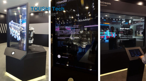 三菱的互動(dòng)還是繼續(xù)沿用2017年的體感賽車小游戲。游戲主要是通過體驗(yàn)者的身體左右搖擺來控制游戲中的駕駛軌道。 現(xiàn)代展臺(tái)互動(dòng)(透明屏+互動(dòng)感應(yīng)設(shè)備)