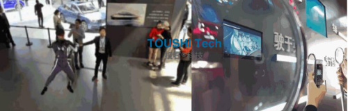 二是放大鏡互動(dòng),通過放大鏡可以觀看屏幕中的視頻,如果沒有通過放大鏡看顯示屏,是一塊干凈的白色。 長安展臺(tái)互動(dòng)(跳舞汽車)