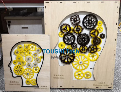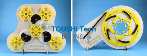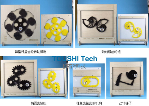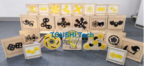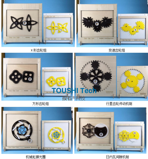 這組模塊包含齒輪、凸輪、杠桿的機械運動,分手動和電動,尺寸一種是400*400mm,一種是300*300mm,模塊有20多種樣式,表面是透明亞克力板,防止被人碰到,人只能碰到旋轉部位。