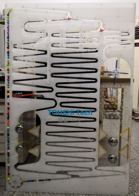 5、電動滾球循環(huán)運動。立面式亞克力電動滾球循環(huán)運動展板,寬800mm高1200mm,小球直徑16mm,DC12V供電。