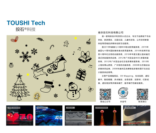 南京投石智能系統(tǒng)有限公司是一家高新技術企業(yè),專注于兒童科技館、公共安全教育、智慧體驗等領域的創(chuàng)新服務,是2008年北京奧運會多媒體供應商、2008年奧林匹克博物館多媒體展廳互動設計服務供應商、2010年上海世博山西館、廣州館綜合服務商、2012年廣州亞運會NOC多媒體服務商、2012年廣州亞運會紀念館多媒體服務商、2018年改革開放四十周年紀念館綜合服務商、2018年年度主題公園卓越沉浸式體驗服務供應商、2019年建國七十周年中塔光影秀服務商、2019年建國七十周年國際媒體港光影秀服務商,主營產品包括增強現實,3D Mapping,互動投影,虛擬翻書,數碼櫥窗,多點觸控,全息投影,投影球,幻影成像,虛擬現實等多媒體展廳,數字展廳的建設服務。 南京展臺:B1-14投石展位