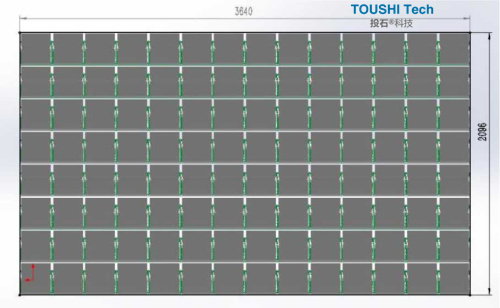 1.傳動裝置:翻頁屏的正面尺寸:3640mmx2096mm,采用8x14=112個單元,每個單元模塊尺寸是:高262mm*寬260mm,單個模塊翻頁數(shù)量:12片,畫面的尺寸是:3620x2066.53mm,畫面采用寫真貼紙貼于模塊的翻板上;