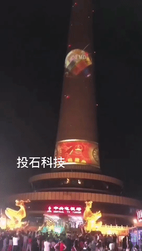 投石智能系統(tǒng)裸眼建筑3D Mapping戶外投影以凹凸有致的外墻立面為演示屏幕,通過大型投影儀遠(yuǎn)距離、寬視角投射,并配合聲光電技術(shù),營造出具有強(qiáng)烈視覺沖擊力的3D藝術(shù)效果。 6.中央電視塔國慶期間光影燈光秀