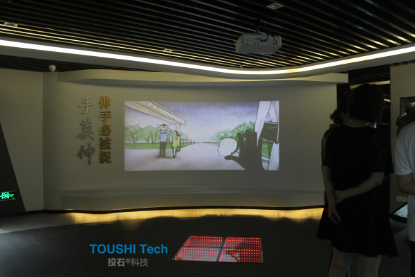 當(dāng)人走過,并觸發(fā)弧形沙畫多媒體裝置展現(xiàn)對應(yīng)視頻內(nèi)容,并且自動播放。 伸手必被捉深淵地板磚展項