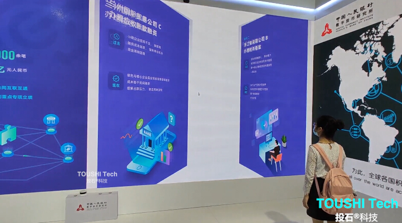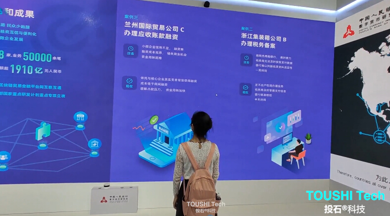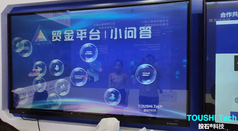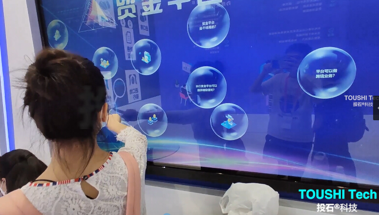 2020年9月4日-9日,在2020年中國(guó)國(guó)際服務(wù)貿(mào)易交易會(huì)展位上,投石智能系統(tǒng)提供氣泡觸摸屏,體感翻牌,雷達(dá)觸摸墻、模擬城市觸摸互動(dòng)等互動(dòng)裝置。 氣泡觸摸屏