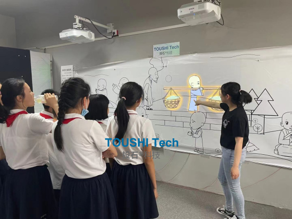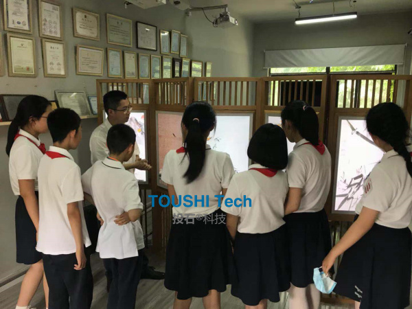 一個(gè)個(gè)與科技有關(guān)的互動小游戲,讓每一個(gè)學(xué)生都忘記了時(shí)間。每次小小操作體驗(yàn)互動的成功,都使孩子們眼睛發(fā)亮,引起歡呼。在此次參觀體驗(yàn)過程中,投石智能系統(tǒng)新媒體藝術(shù)展廳互動設(shè)備令師生們都大開眼界,興奮之情溢于言表。