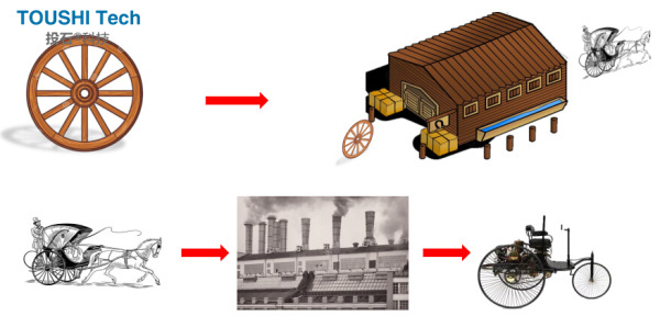 馬車隨著馬踏聲路過一個冒著濃煙的蒸汽工廠之后,出來的變成了一輛蒸汽汽車,蒸汽汽車一路冒著蒸汽行駛著。它前方有一顆圓圓的車燈。