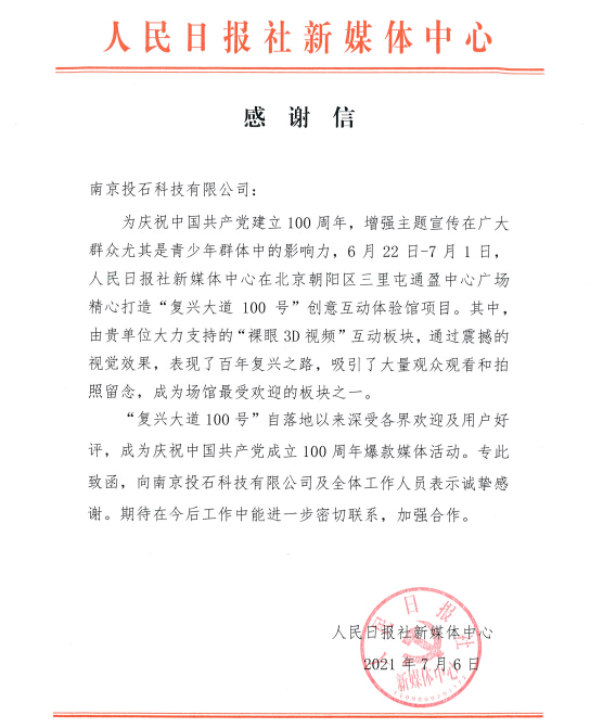 2021年7月6日,投石智能系統(tǒng)收到來自人民日報(bào)社新媒體中心的感謝信。為慶祝中國共產(chǎn)黨建立100周年,增強(qiáng)主題宣傳在廣大群眾尤其是青少年群體中的影響力,2021年6月22日-7月1日,人民日報(bào)社新媒體中心在北京朝陽區(qū)三里屯通盈中心廣場精心打造“復(fù)興大道100號”創(chuàng)意互動(dòng)體驗(yàn)館項(xiàng)目。其中,由投石智能系統(tǒng)大力支持并提供技術(shù)支持的“裸眼3D視頻”互動(dòng)板塊,通過震撼的視覺效果,表現(xiàn)了百年復(fù)興之路,吸引了大量觀眾觀看和拍照留念,成為場館最受歡迎的板塊之一。