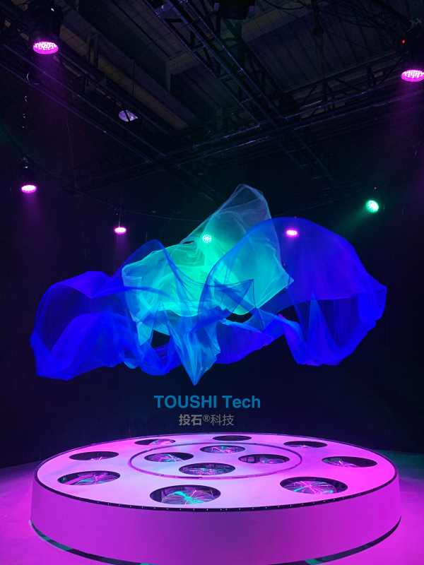 光影構(gòu)成的線條在空中漂浮,打造一個由堅果投射出的世界。地面的圓環(huán)投射出,堅果想象世界的歡迎密令。絲巾控制由工業(yè)風扇、風扇控制器以及絲巾組成。多臺工業(yè)風扇均勻安放于絲巾的正上方,出風方向正對絲巾的中心,當其通電后,工業(yè)風扇有強風輸出,可以將其上方的絲巾吹起,風扇轉(zhuǎn)速越高,絲巾就會被吹得越高,反之風扇轉(zhuǎn)速越低,絲巾高度越低。項目位于上海黃浦區(qū)外馬路1162號天宴秀場。