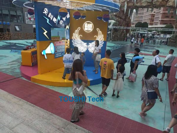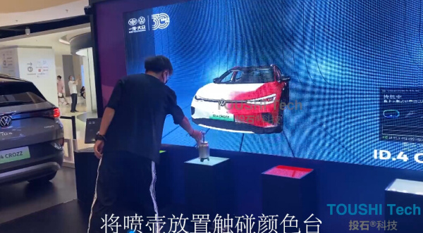 投石智能系統(tǒng)凌空噴漆涂鴉玩法說明:1、軟件啟動:顯示汽車旋轉(zhuǎn)場景,屏幕上有體驗提示語;2、體驗者拿起噴槍靠近油漆桶模型射擊進行取色;3、噴槍取色后對準屏幕中汽車進行噴漆;4、體驗時間60秒,時間結(jié)束自動拍照生成二維碼,微信掃描二維碼可以獲取照片;5、倒計時15秒結(jié)束后返回待機頁面。