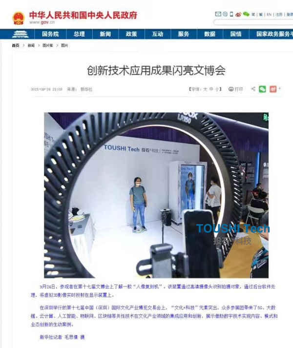 中華人民共和國中央人民政府官網(wǎng)新聞圖片頻道2021年9月24日報道創(chuàng)新技術應用成果閃亮深圳文博會,介紹投石智能系統(tǒng)"人像復刻機”。