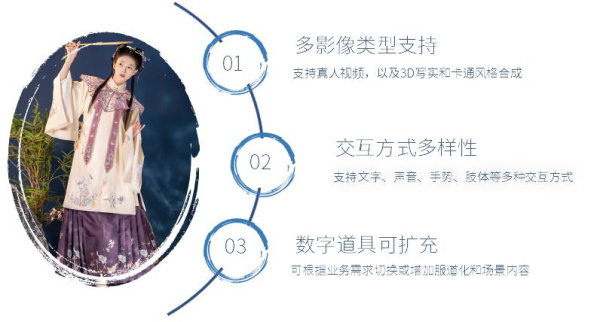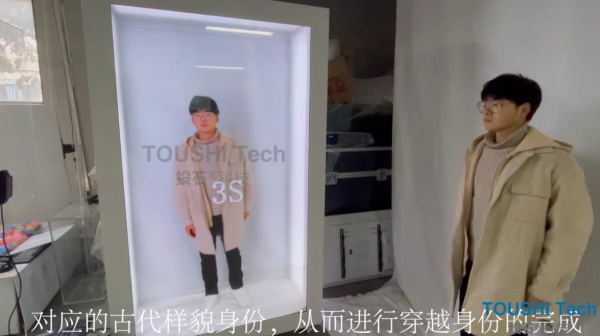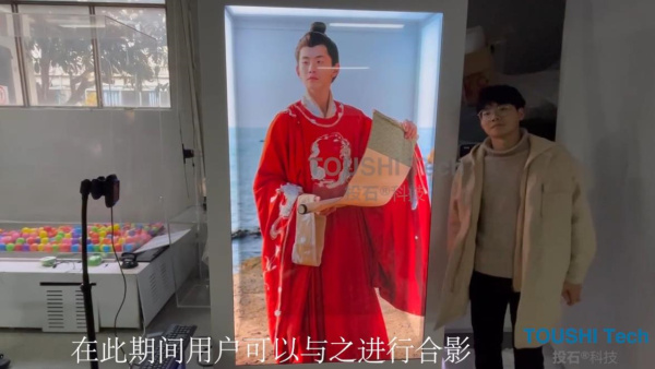 投石智能系統(tǒng)將科技與國潮結(jié)合,采用透明屏這款設(shè)備來完成穿越古代的幻想,透明屏采用3D寫實(shí)的創(chuàng)作概念,通過4K高清攝像頭識別及后臺軟件處理,將現(xiàn)實(shí)人像與穿漢服的人物共處于同一時(shí)間與空間,以此為觀眾達(dá)到非凡的視覺感官體驗(yàn)。