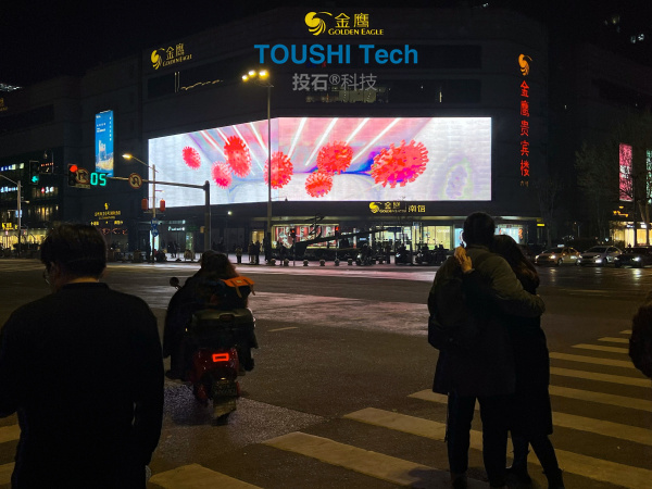 投石智能系統(tǒng)戶(hù)外led裸眼3D公益廣告:病毒肆虐,檢測(cè)讓病毒無(wú)所遁形,大白們辛苦了。