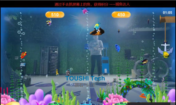 小朋友在有線條的畫紙上涂顏色,再用掃描儀掃一掃,利用高科技掃描成像技術(shù)讓畫像成真。畫好的圖像進(jìn)入場景里以特定的姿態(tài)在畫中游動(dòng)。 2.體感捕魚達(dá)人
