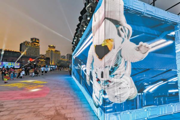 在“人體復(fù)刻機(jī)”體驗(yàn)區(qū),通過全息影像,市民只要在摳像設(shè)備前留下15秒的動作影像,轉(zhuǎn)眼間就能投射到裸眼3D透明屏里,出現(xiàn)一個(gè)立體的自己。“太神奇了,感覺好像多了一個(gè)雙胞胎姐妹。”市民郭女士說。 ▲青年廣場超大屏幕的裸眼3D秀