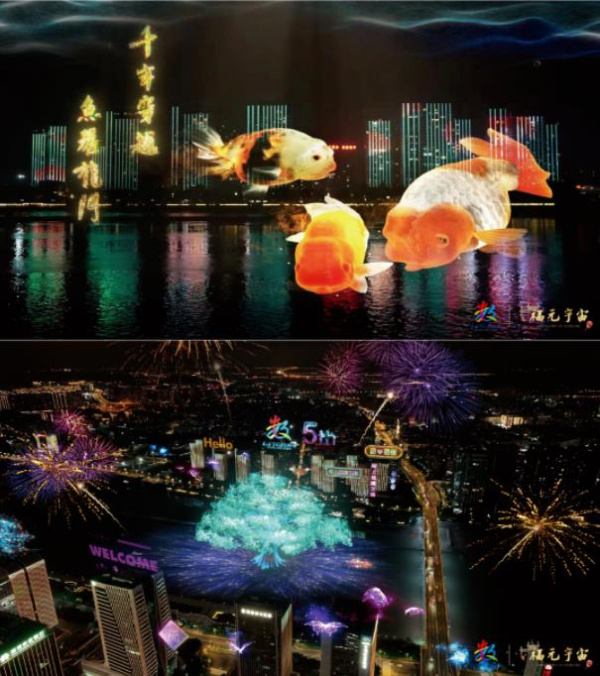 此次數(shù)字交互之夜分為三大章節(jié),以時(shí)間為線闡述福州的由古至今再到未來的數(shù)字新紀(jì)元,將數(shù)字燈光與虛擬藝術(shù)相結(jié)合,融入了中國文化、科技及“龍、魚”、展會吉祥物等形象,展現(xiàn)數(shù)字中國的科技魅力。