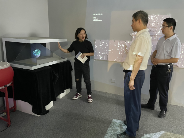 在投石智能系統(tǒng)的新媒體藝術(shù)展廳,高總向薛區(qū)長(zhǎng)一行介紹了公司近年參與建設(shè)的大型文旅夜游產(chǎn)品和案例,還詳細(xì)介紹了展廳互動(dòng)裝置并一一展示效果及功能應(yīng)用范圍等。