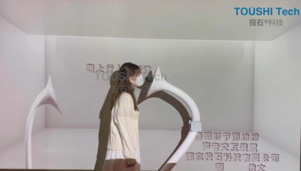 投石留聲墻裝置能夠有效的提取聲音信號(hào),并將之處理成有效的數(shù)字信號(hào),進(jìn)而將數(shù)字信號(hào)轉(zhuǎn)變?yōu)槲覀兿胍?jiàn)到的具象化形象。聲音具象化后的文字能夠使人有效的感受語(yǔ)言的力量。它的外觀是白色的喇叭花形狀話筒。當(dāng)體驗(yàn)者對(duì)喇叭話筒說(shuō)話,系統(tǒng)會(huì)實(shí)時(shí)識(shí)別內(nèi)容并轉(zhuǎn)換成立體文字從大屏幕上彈出并一層層疊加。將立體文字賦予獨(dú)特的層疊動(dòng)感,更顯得生動(dòng),同時(shí)更好提升了趣味互動(dòng)感。該裝置也可將識(shí)別的語(yǔ)音轉(zhuǎn)換成特定的圖案,會(huì)顯示不同的視覺(jué)效果。