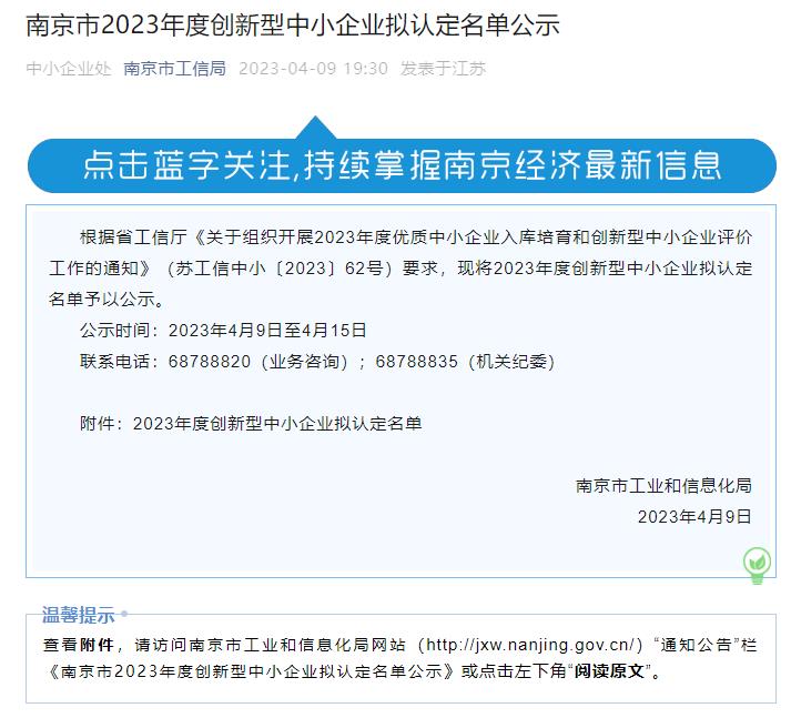 圖:南京市2023年度創(chuàng)新型中小企業(yè)擬認定名單公示