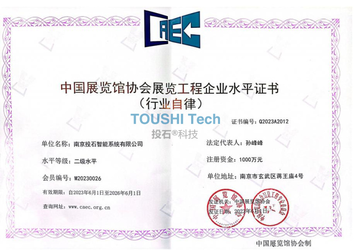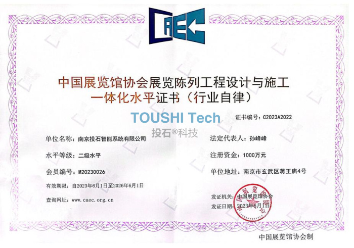 為提高綜合業(yè)務(wù)能力,擴展業(yè)務(wù)范圍,2023年6月,南京投石智能系統(tǒng)有限公司迎來利好消息。經(jīng)中國展覽館協(xié)會審核批準,南京投石智能系統(tǒng)有限公司順利通過“中國展覽館協(xié)會展覽陳列工程設(shè)計與施工一體化水平證書(行業(yè)自律)”二級水平和“中國展覽館協(xié)會展覽工程企業(yè)水平證書(行業(yè)自律)”二級水平兩項資質(zhì),該榮譽的取得體現(xiàn)政府主管部門和業(yè)界對南京投石的高度認可,同時為深入開拓展覽展示工程市場提供了強有力的支撐。
