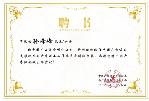 2023年7月12日,中國(guó)廣告協(xié)會(huì)光影技術(shù)與廣告設(shè)備工作委員會(huì)在黃山正式成立。此次出席成立儀式的有中國(guó)廣告協(xié)會(huì)領(lǐng)導(dǎo)、知名國(guó)際品牌企業(yè)相關(guān)負(fù)責(zé)人、品牌營(yíng)銷服務(wù)機(jī)構(gòu)負(fù)責(zé)人、學(xué)術(shù)專家、權(quán)威媒體負(fù)責(zé)人等。大會(huì)產(chǎn)生了中國(guó)廣告協(xié)會(huì)國(guó)際傳播工作委員會(huì)主任、執(zhí)行主任、副主任、常務(wù)委員、秘書處組成人員,并聘請(qǐng)了專家顧問。其中南京投石科技有限公司董事長(zhǎng)孫峰峰,被聘請(qǐng)擔(dān)任中國(guó)廣告協(xié)會(huì)光影技術(shù)與廣告設(shè)備工作委員會(huì)副秘書長(zhǎng)職務(wù)。