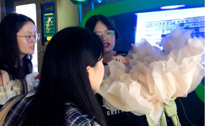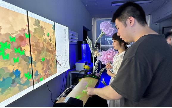 該作品給予了靜態(tài)古典畫(huà)作以數(shù)字新生命,重構(gòu)了傳統(tǒng)藝術(shù)形式,打造“古典與科技”相融合的視聽(tīng)盛宴。同學(xué)們用自己的手指模仿彈琴,周?chē)S指尖跳躍而變化的琴聲和飛舞的蝴蝶,使同學(xué)們感到仿佛早已身處山林清泉之間。