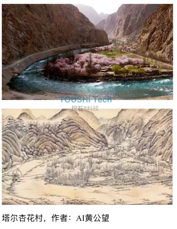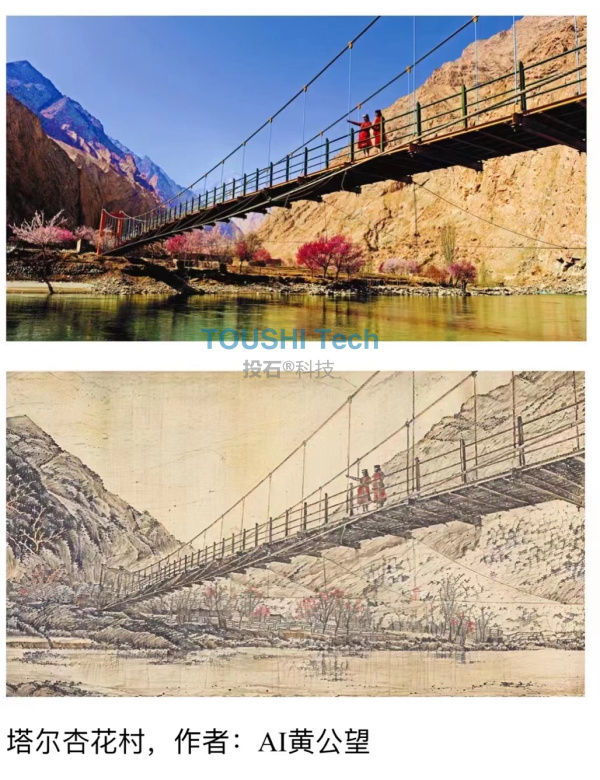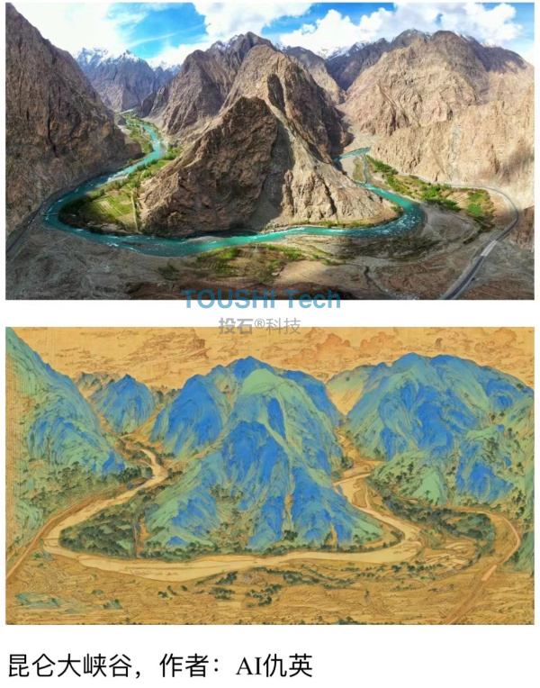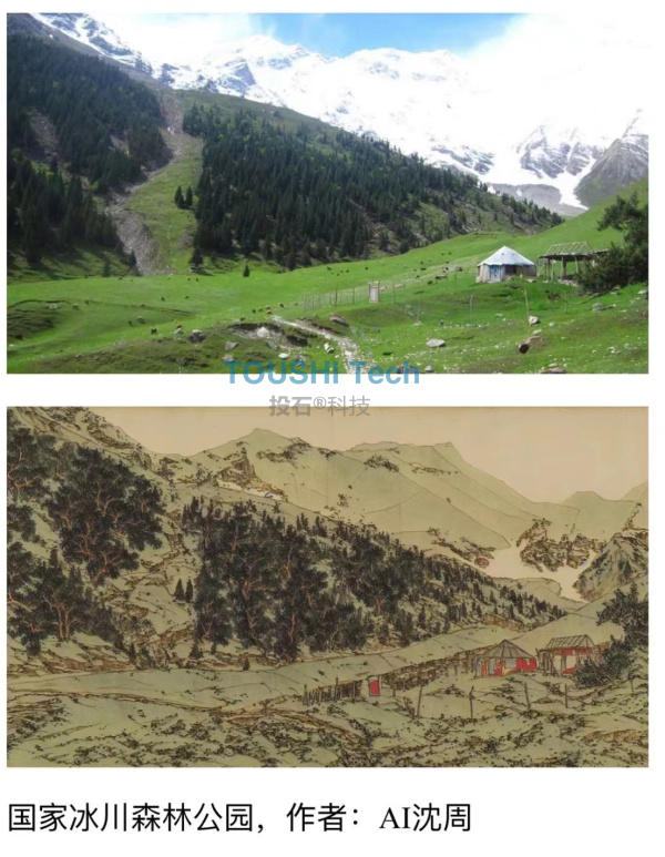 軟件內(nèi)展示了克州經(jīng)典景區(qū):“國(guó)家冰川森林公園”“昆侖大峽谷”以及“塔爾杏花村”,通過(guò)人工智能算法,結(jié)合投石智能自主訓(xùn)練的元明畫(huà)家“黃公望”“仇英”“沈周”的數(shù)據(jù)模型,將景區(qū)風(fēng)光轉(zhuǎn)繪為名家經(jīng)典古典水墨畫(huà)作,借助科技的力量完成跨越時(shí)間與空間的創(chuàng)新合作。