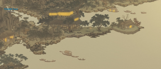 3.本案例中的小舟是有三條對(duì)應(yīng)的路線,分別為上中下,掃描儀掃描生成后,會(huì)在對(duì)應(yīng)的位置出現(xiàn)對(duì)應(yīng)的小舟,然后小舟會(huì)以一定的速度移動(dòng)到畫(huà)面指定位置(本案例為岸邊)。