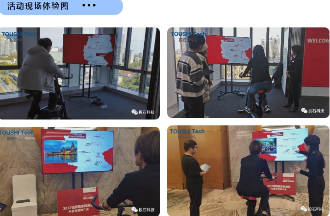 2023年11月10日,南京投石為2023德國國家旅游局年度旅游推介會在北京亮馬橋的活動展出提供騎車漫游德國景點互動裝置和體感摳像景點拍照互動裝置,11月13日在北京希爾頓酒店活動提供騎車漫游德國景點互動裝置。