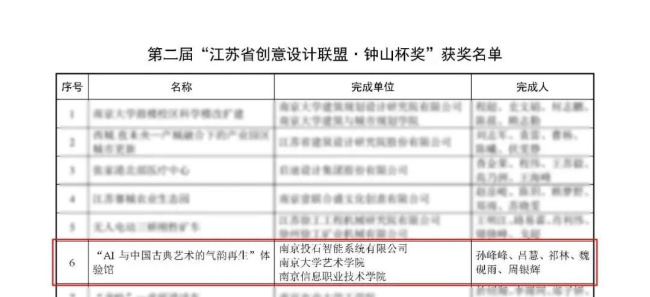 2023年12月22日,江蘇省創(chuàng)意設(shè)計(jì)聯(lián)盟發(fā)布關(guān)于第二屆“江蘇省創(chuàng)意設(shè)計(jì)聯(lián)盟·鐘山杯獎(jiǎng)”獲獎(jiǎng)作品公示的通知。其中,南京投石智能系統(tǒng)有限公司與南京大學(xué)和南京信息職業(yè)技術(shù)學(xué)院聯(lián)合打造的產(chǎn)學(xué)研作品《“AI與中國古典藝術(shù)的氣韻再生”體驗(yàn)館》榮獲第二屆“江蘇省創(chuàng)意設(shè)計(jì)聯(lián)盟·鐘山杯獎(jiǎng)”,與常熟理工學(xué)院合作的產(chǎn)學(xué)研項(xiàng)目《天倫之悅—隔代親子陪伴圈椅設(shè)計(jì)》獲得第二屆“江蘇省創(chuàng)意設(shè)計(jì)聯(lián)盟·鐘山杯獎(jiǎng)”提名獎(jiǎng),此次獲獎(jiǎng)是對投石智能在產(chǎn)學(xué)研項(xiàng)目的肯定和創(chuàng)意設(shè)計(jì)與藝術(shù)創(chuàng)新方面的表彰。