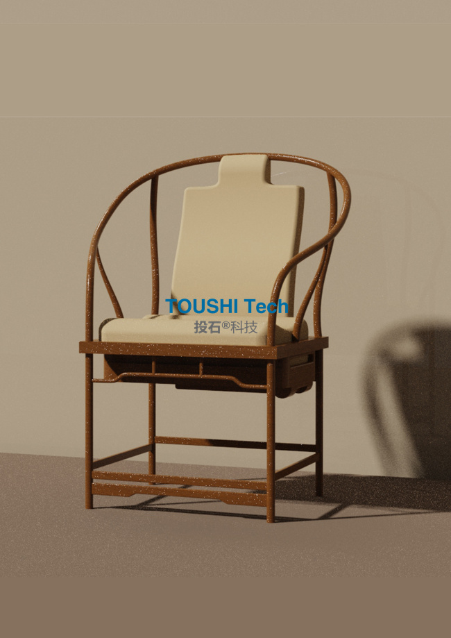 另一作品《天倫之悅—隔代親子陪伴圈椅設(shè)計(jì)》基于無障礙理念的空巢老人家用坐具,主要關(guān)注家庭親情和隔代陪伴的社會(huì)問題。通過設(shè)計(jì)一款舒適、實(shí)用的圈椅,為空巢老人營造一種充滿人性化關(guān)懷,舒適便捷的生活環(huán)境。倡導(dǎo)家庭成員之間的互動(dòng)和溝通。這款設(shè)計(jì)作品體現(xiàn)了投石智能對于人文關(guān)懷和社會(huì)問題的關(guān)注,也是產(chǎn)學(xué)研合作在實(shí)踐中的具體應(yīng)用。 這兩件作品通過產(chǎn)學(xué)研合作的模式,使得我們能夠?qū)⒗碚撝R(shí)與實(shí)踐經(jīng)驗(yàn)相結(jié)合,將學(xué)術(shù)研究成果轉(zhuǎn)化為實(shí)際產(chǎn)品,滿足市場需求。同時(shí)也體現(xiàn)了投石智能在科技與藝術(shù)、設(shè)計(jì)與人文等多個(gè)領(lǐng)域的深度探索和創(chuàng)新實(shí)踐。