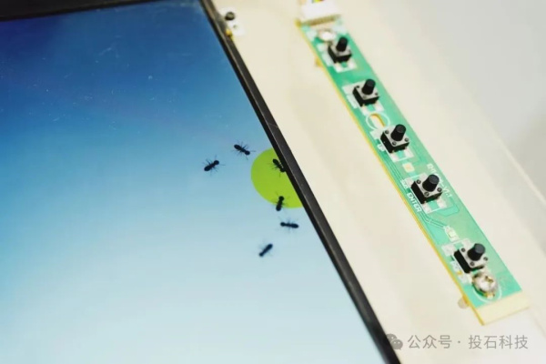藝術(shù)家運(yùn)用了植物電原理,使屏幕里的小小螞蟻聽得見我們的聲音,也能感受到環(huán)境的光線變化。當(dāng)有人驚動(dòng)它們時(shí),它們會迅速四散而跑。