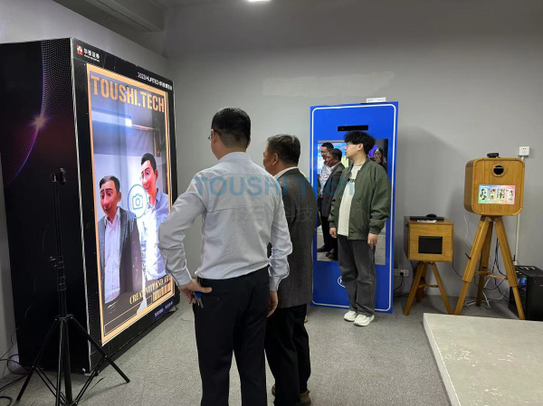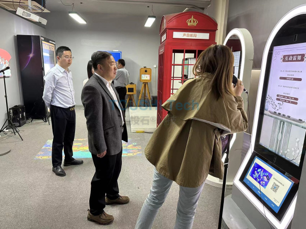 在孫峰峰的陪同下,張延安一行參觀了投石科技新媒體藝術(shù)展示廳并體驗(yàn)了公司研發(fā)的各類(lèi)互動(dòng)裝置。投石工作人員詳細(xì)給他們介紹了各個(gè)互動(dòng)裝置的技術(shù)原理和應(yīng)用場(chǎng)景等。這些互動(dòng)裝置可以通過(guò)手勢(shì)識(shí)別、語(yǔ)音識(shí)別等方式與用戶(hù)進(jìn)行實(shí)時(shí)互動(dòng),提供豐富的信息展示和娛樂(lè)體驗(yàn)。還有展廳內(nèi)的AIGC拍照機(jī),氣韻再生AI繪畫(huà)大模型等人工智能產(chǎn)品,是投石科技把人工智能領(lǐng)域的應(yīng)用場(chǎng)景創(chuàng)新性帶入到文旅線(xiàn)下體驗(yàn)場(chǎng)景的領(lǐng)先創(chuàng)舉。