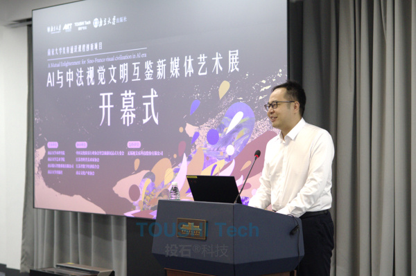 南京法語聯(lián)盟主任David Couvidat發(fā)表了熱情洋溢的致辭,他稱贊此次展覽是促進(jìn)中法友誼的一份珍貴的禮物。南京大學(xué)的師生的創(chuàng)作力、科研能力以及與企業(yè)合作對AI技術(shù)的創(chuàng)新使用能力對促進(jìn)中法交流必將發(fā)揮更加重要的作用。