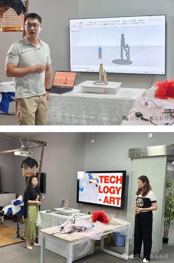 8月23日,訓(xùn)練營(yíng)迎來了最為激動(dòng)人心的時(shí)刻——原型制作與展示。在老師們的指導(dǎo)下,學(xué)員們將創(chuàng)意轉(zhuǎn)化為實(shí)物,一件件充滿創(chuàng)意與科技感的機(jī)械藝術(shù)裝置作品應(yīng)運(yùn)而生。 在下午的結(jié)業(yè)儀式上,學(xué)員們分組展示了自己的作品,每一件裝置都充滿了創(chuàng)意與巧思,將機(jī)械的力量與藝術(shù)的美感產(chǎn)生融合,展現(xiàn)出了強(qiáng)烈的視覺沖擊力和獨(dú)特的藝術(shù)魅力。學(xué)員們通過分享創(chuàng)作過程中的心得與體會(huì),加深了對(duì)投石智能提出的“藝術(shù)與科技方法論”的理解,也激發(fā)了更多關(guān)于機(jī)械藝術(shù)裝置創(chuàng)作的靈感與思考。 南師大中北學(xué)院美術(shù)與設(shè)計(jì)學(xué)院環(huán)境設(shè)計(jì)專業(yè)副教授余然作為學(xué)員代表表示:參與投石智能組織的機(jī)械藝術(shù)裝置訓(xùn)練營(yíng)讓我深刻體會(huì)到跨學(xué)科融合對(duì)學(xué)生創(chuàng)意思維發(fā)展的重要性。在訓(xùn)練營(yíng)中,我們通過機(jī)械原理與藝術(shù)表達(dá)的結(jié)合,打破了傳統(tǒng)設(shè)計(jì)思維的桎梏,賦予了設(shè)計(jì)作品更多的動(dòng)感與互動(dòng)性。這種實(shí)踐性極強(qiáng)的訓(xùn)練方式,激發(fā)了我對(duì)機(jī)械結(jié)構(gòu)與美學(xué)表現(xiàn)的興趣,還提升了動(dòng)手能力與團(tuán)隊(duì)協(xié)作意識(shí)。通過這次訓(xùn)練營(yíng),我更加認(rèn)識(shí)到將科技與藝術(shù)相結(jié)合的教學(xué)模式,將為未來環(huán)境設(shè)計(jì)領(lǐng)域培養(yǎng)出更具創(chuàng)新精神的設(shè)計(jì)人才奠定堅(jiān)實(shí)基礎(chǔ),也為未來與投石智能開展產(chǎn)教融合和微專業(yè)課程共同建設(shè)更有信心和奠定了成熟的技術(shù)路徑。 來自南京工程學(xué)院藝術(shù)與設(shè)計(jì)學(xué)院的教師許悅、許娟、閆勝昝等老師都表示感謝科普美協(xié)和投石智能搭建的高級(jí)機(jī)械藝術(shù)裝置工作坊平臺(tái),這次訓(xùn)練營(yíng)科技與藝術(shù)的深度融合激發(fā)了大家對(duì)機(jī)械藝術(shù)裝置創(chuàng)作的熱情,這種跨界融合的平臺(tái)將為教師們的創(chuàng)作帶來無限可能,都期待未來能有更多這樣的機(jī)會(huì),探索科技與藝術(shù)的無限可能。 來自南京審計(jì)大學(xué)金審學(xué)院藝術(shù)設(shè)計(jì)學(xué)院的教師劉蒙、陳天星等老師都表示這次訓(xùn)練營(yíng)讓大家深刻感受到了科技與藝術(shù)的完美結(jié)合,通過與來自不同領(lǐng)域的專家和同行交流,對(duì)未來課程教學(xué)和產(chǎn)教融合帶來了新的技術(shù)形式的嘗試。 江蘇省科普美術(shù)家協(xié)會(huì)副秘書長(zhǎng)周芳竹代表協(xié)會(huì)為成績(jī)合格的學(xué)員頒發(fā)了結(jié)業(yè)證書,投石智能董事長(zhǎng)孫峰峰對(duì)大家的作品給予了高度評(píng)價(jià),并做專業(yè)點(diǎn)評(píng)和建議。這些優(yōu)秀作品不僅體現(xiàn)了學(xué)員們?cè)谟?xùn)練營(yíng)期間的辛勤付出與不懈努力,也彰顯了科技與藝術(shù)融合的巨大潛力與廣闊前景。 總結(jié)與展望