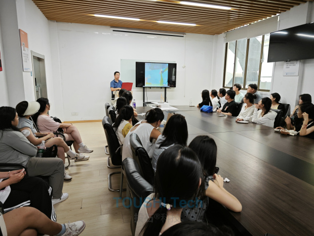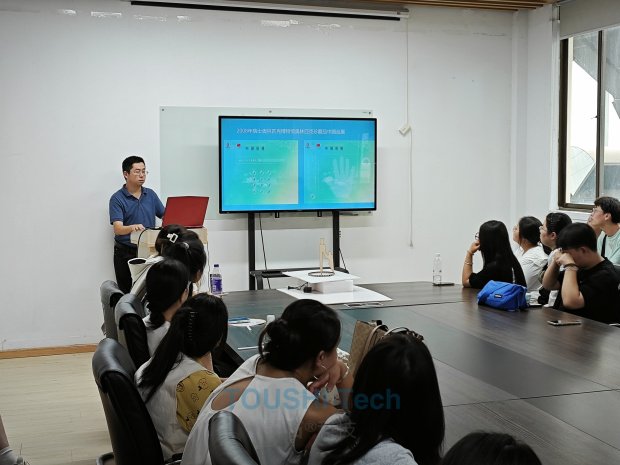 參觀之前,投石科技董事長孫峰峰在會議室為師生們精心準(zhǔn)備了一場別開生面的分享會。通過精心設(shè)計(jì)的PPT演示與視頻資料,介紹了投石近年來在數(shù)字藝術(shù)領(lǐng)域的成就,特別是那些引領(lǐng)行業(yè)潮流、跨越傳統(tǒng)與未來邊界的優(yōu)秀案例,引導(dǎo)師生們從成像介質(zhì)、人機(jī)交互手段、互動(dòng)形式、可視化工具軟件開發(fā)、AIGC等五個(gè)維度去理解投石智能提出的“藝術(shù)與科技的創(chuàng)作方法論”。孫總結(jié)合前沿新媒體交互技術(shù)進(jìn)行案例賞析與技術(shù)分析,通過對藝術(shù)和科技相互作用的探索,更好地理解二者之間的關(guān)系,以及如何在實(shí)際運(yùn)用領(lǐng)域中進(jìn)行創(chuàng)新和表達(dá),孫總通過介紹數(shù)字內(nèi)容生產(chǎn)方式變革的三個(gè)趨勢,引導(dǎo)大家思考開源軟件和開源硬件對于數(shù)字媒體帶來的深刻變革。