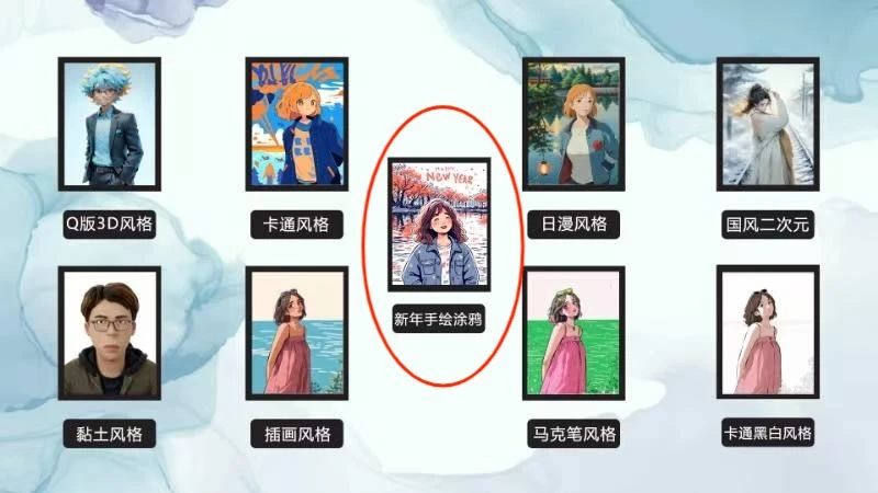 投石AI拍照機(jī)提供多種AIGC風(fēng)格轉(zhuǎn)繪功能,此次展示新年手繪涂鴉風(fēng)格