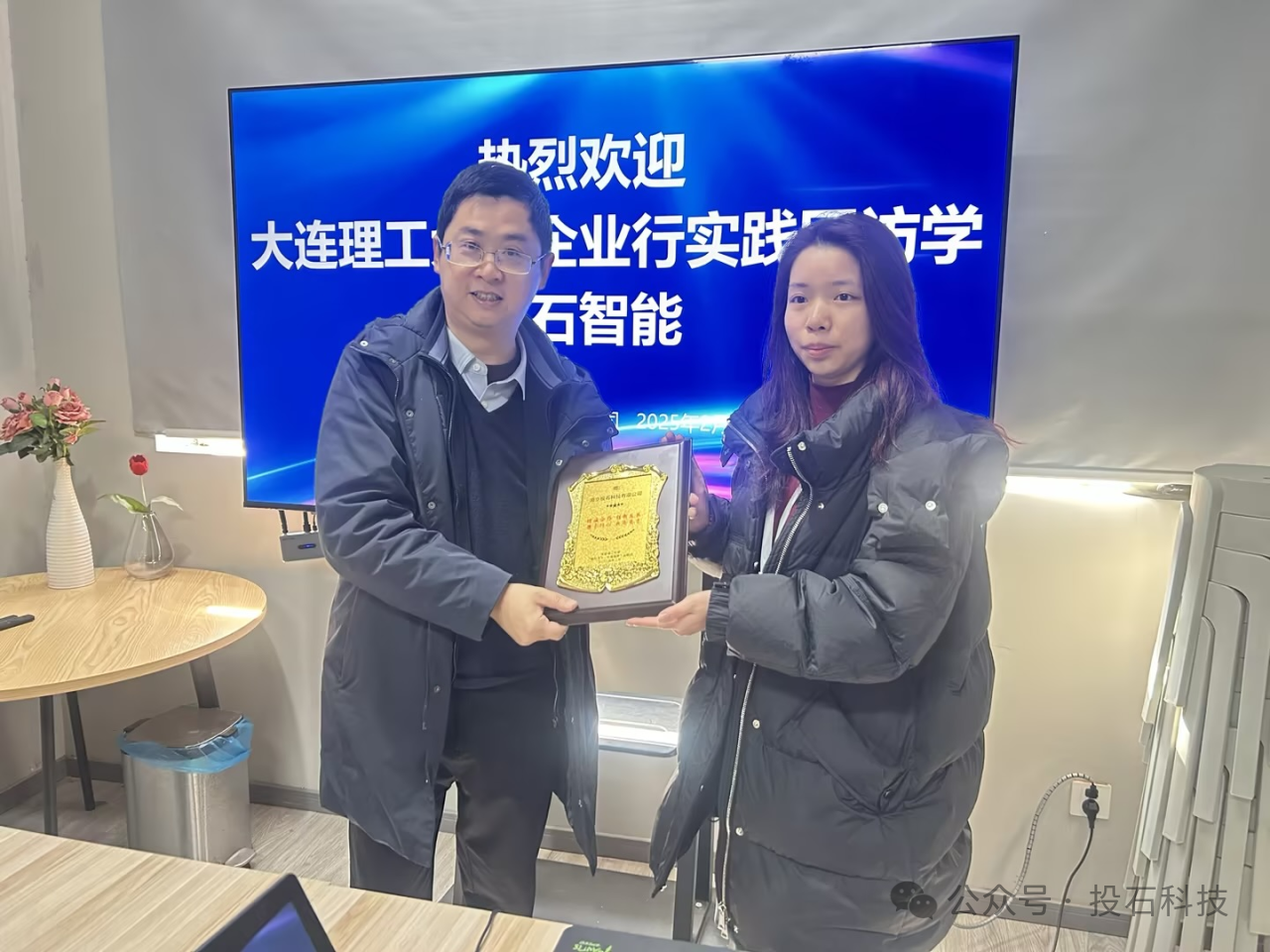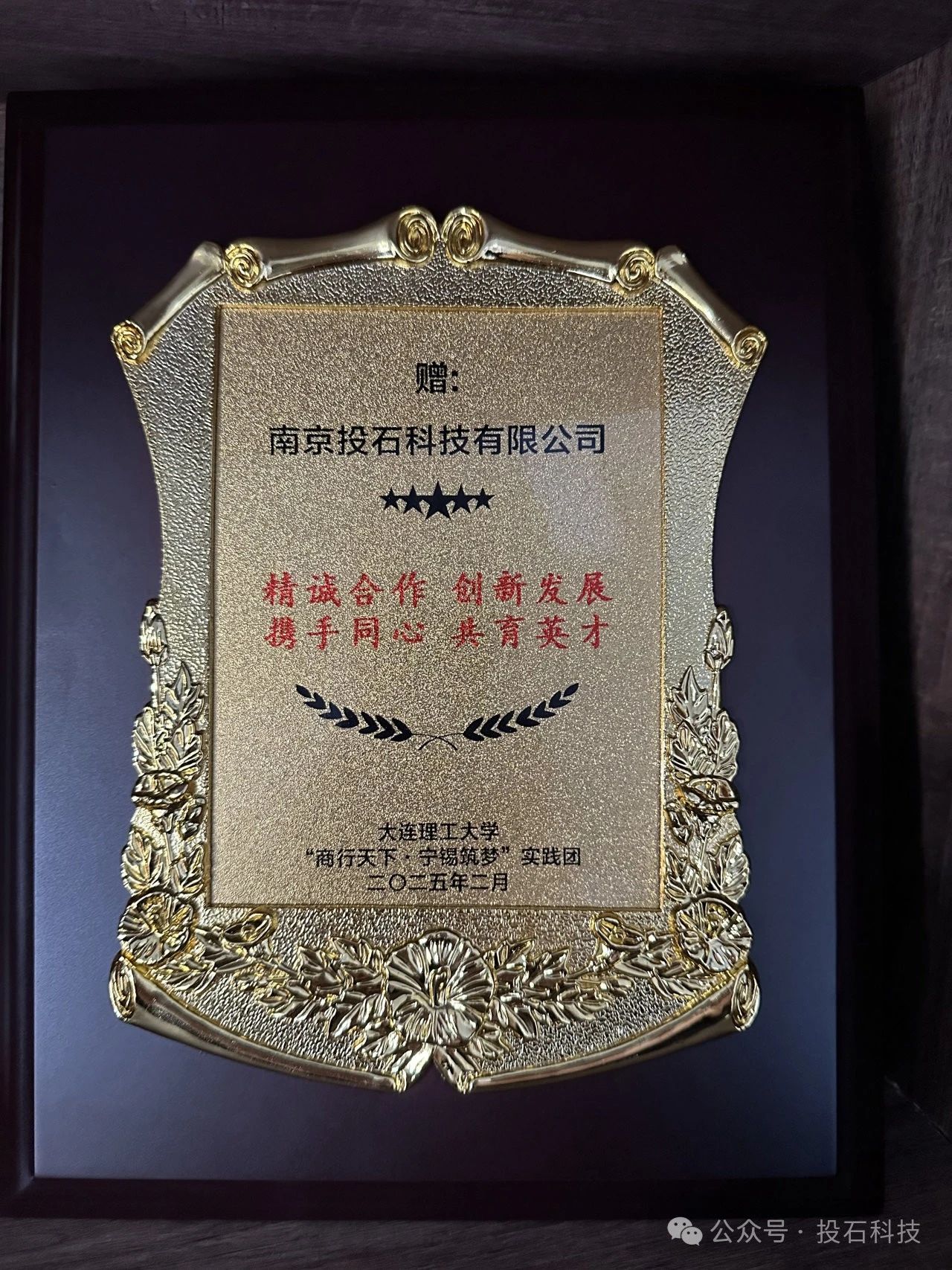 大連理工大學師生贈投石科技紀念牌一塊。上書:精誠合作 創(chuàng)新發(fā)展 攜手同心 共育英才。