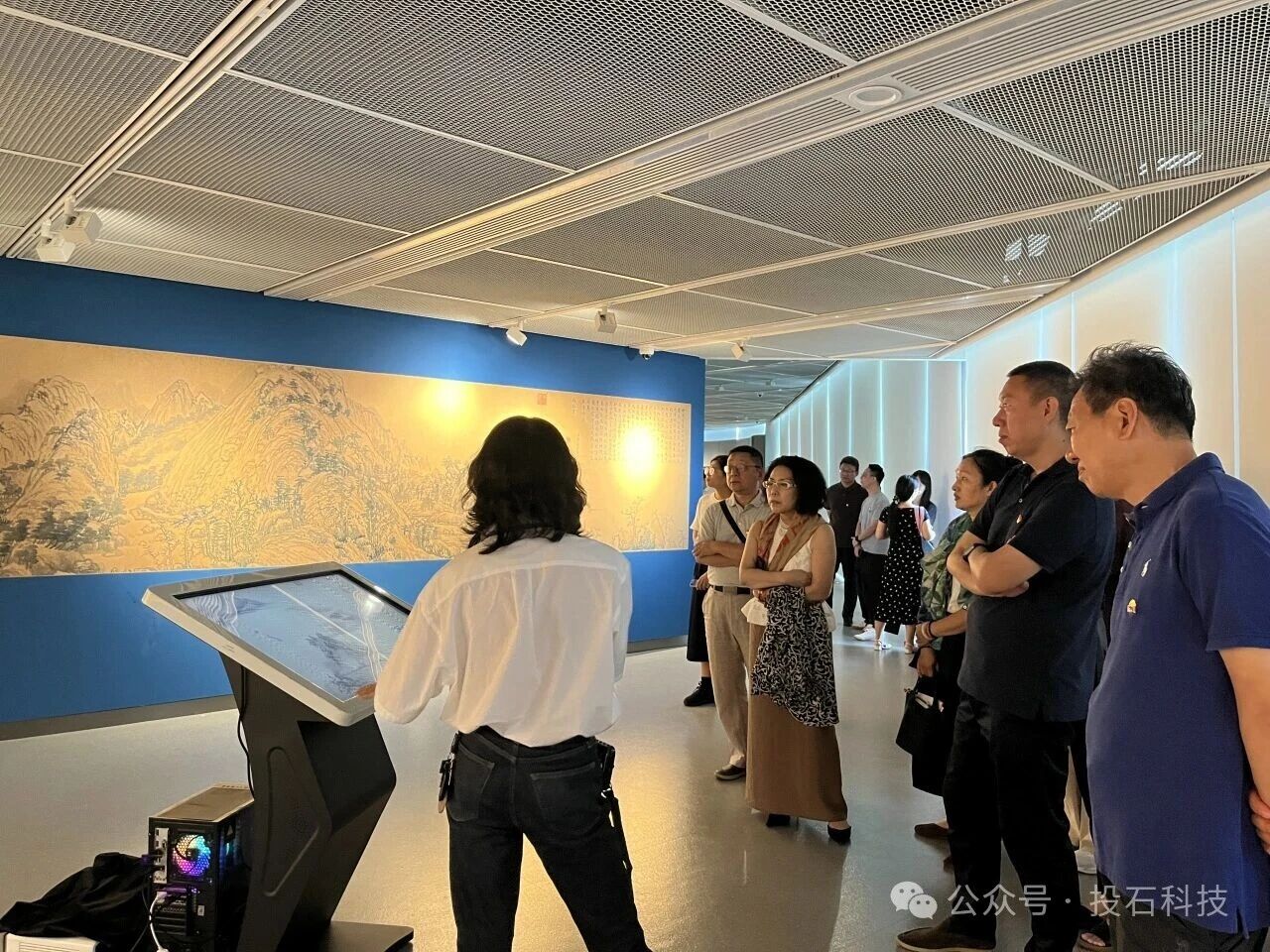 黨員一行還體驗了展廳內(nèi)各類交互裝置。在“墨影隨行”AI共創(chuàng)裝置前,領(lǐng)導(dǎo)們體驗了簡單線條繪出黃公望山水的共創(chuàng)藝術(shù),對展品的設(shè)計理念與交互體驗大加贊賞。