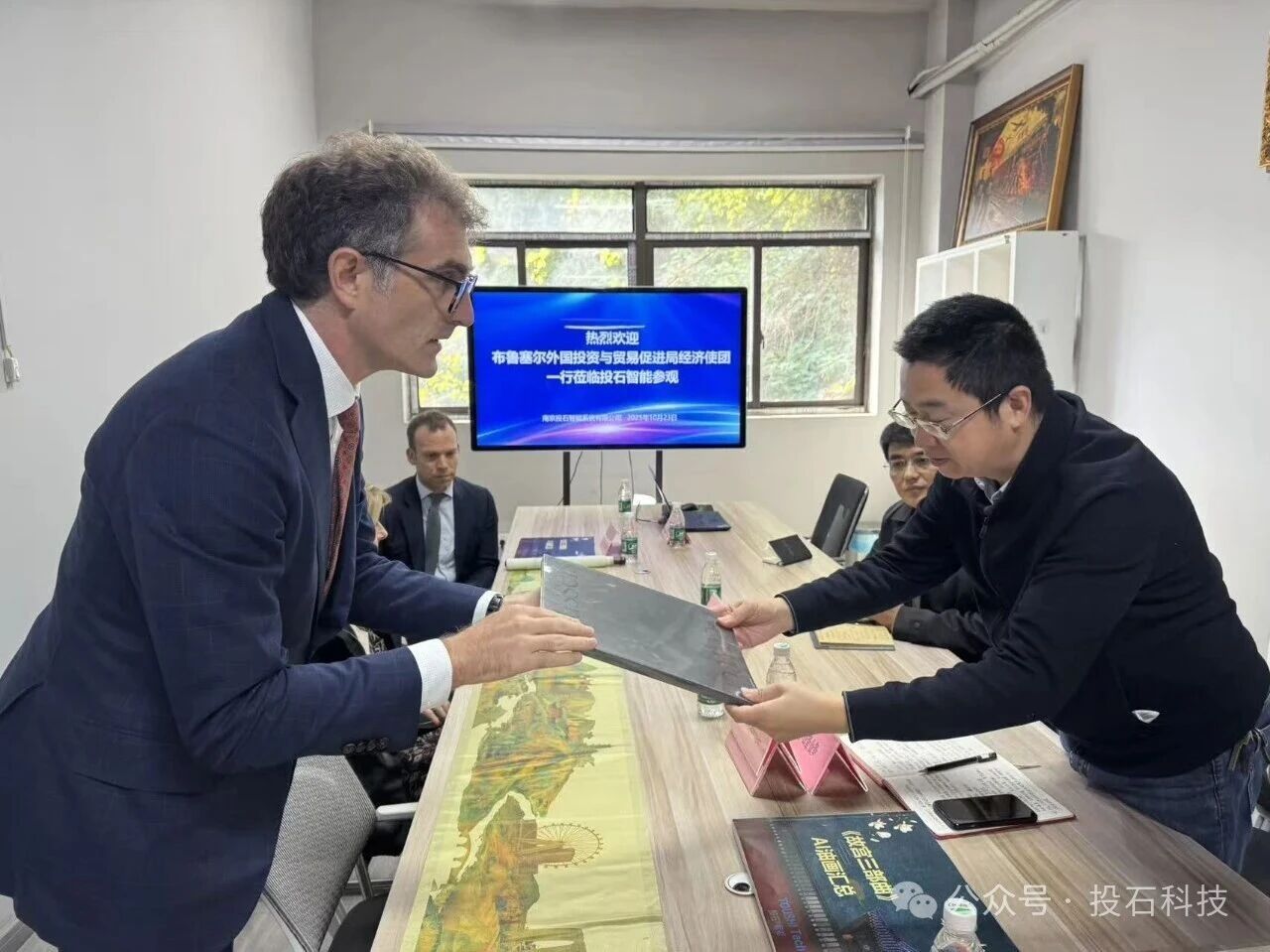 2025年10月23日,比利時(shí)布魯塞爾外國(guó)投資與貿(mào)易促進(jìn)局經(jīng)濟(jì)使團(tuán),布魯塞爾駐華首席代表,比利時(shí)駐上海總領(lǐng)事館經(jīng)濟(jì)及商務(wù)領(lǐng)事Mittias Debroyer(馬漢)、布魯塞爾外國(guó)投資與貿(mào)易促進(jìn)局 東亞區(qū)投資經(jīng)理Arne Aertbeliën、比利時(shí)聯(lián)邦財(cái)政公共服務(wù)部高級(jí)稅務(wù)官員Michela Ritondo、8AM 集團(tuán)創(chuàng)始人及總經(jīng)理Maxime Dechamps、布魯塞爾外國(guó)投資與貿(mào)易促進(jìn)局商務(wù)官員高路華一行蒞臨投石科技參觀(guān)座談。投石科技董事長(zhǎng)孫峰峰熱情接待并全程陪同參觀(guān)座談。座談后,雙方合影留念。