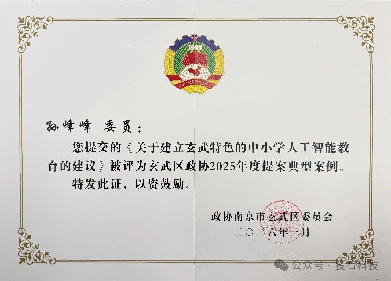 會(huì)上,孫峰峰的《關(guān)于建立玄武特色的中小學(xué)人工智能教育的建議》作為玄武區(qū)政協(xié)2025年度提案典型案例獲得了表?yè)P(yáng)。