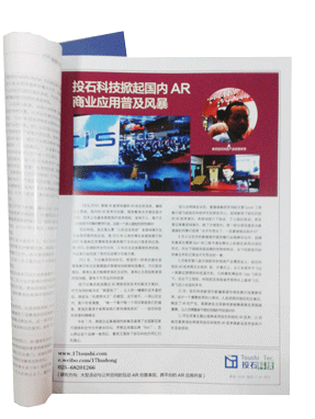 中華人民共和國(guó)文化部主管,國(guó)家級(jí)文化類核心期刊——《文化月刊》2012年十月刊對(duì)我司AR商業(yè)運(yùn)用進(jìn)行長(zhǎng)篇報(bào)道??闹赋鰢?guó)內(nèi)AR雖起步較晚,卻發(fā)展迅猛,特別是在商業(yè)運(yùn)用這塊的發(fā)展速度,數(shù)據(jù)令人振奮??恼故玖?/span>投石智能系統(tǒng)AR技術(shù)在商業(yè)運(yùn)用取得的驕人成績(jī),AR增強(qiáng)現(xiàn)實(shí)商業(yè)運(yùn)用的處于國(guó)內(nèi)領(lǐng)先地位。