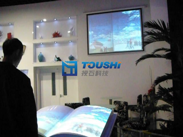 投石虛擬翻書又稱電子翻書、空中翻書,它是在展廳里放置的一本翻開的虛擬圖書,當(dāng)觀眾伸手做出翻書的動(dòng)作時(shí),這本虛擬圖書就會(huì)真的可以翻頁,讓觀眾瀏覽書的內(nèi)容,在展示栩栩如生的動(dòng)態(tài)翻頁效果時(shí)并伴有音效。觀眾在驚嘆神奇的虛擬技術(shù)的同時(shí),也會(huì)對圖書的內(nèi)容產(chǎn)生興趣。虛擬翻書原理是利用影像識(shí)別技術(shù)獲取參觀者的動(dòng)作,并將該動(dòng)作傳輸給計(jì)算機(jī)進(jìn)行處理,計(jì)算機(jī)內(nèi)的應(yīng)用程序則根據(jù)所捕捉的信號驅(qū)動(dòng)多媒體動(dòng)畫進(jìn)行翻書的效果表現(xiàn)。參觀者只需要站在展臺(tái)前方,伸出手臂,在空中做出左右揮動(dòng)手臂的動(dòng)作,則計(jì)算機(jī)就能識(shí)別出參觀者的動(dòng)作,參觀者面前的電子書就會(huì)隨著手臂的左右揮動(dòng)進(jìn)行前后的翻頁,看起來很是神奇??罩蟹瓡恼故拘问娇蓱?yīng)用于各種博物館、展覽館、臨時(shí)展覽等,或者是一些服務(wù)行業(yè)的自助型宣傳廣告形式。